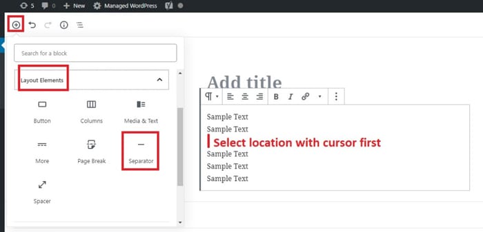 You can separate text and photos by placing a line between them. In the Classic Editor, this was known as an HR or spacer line. Place your cursor where you want to add a line, and click the plus sign “+” icon. Select the Separator block from the menu. At the right sidebar under the Block tab, you can click the down arrow at the Styles tab. Here you can select a short line, wide line or dots.