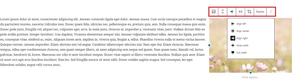 Once an image is inserted on the page, formatting options appear above the image block. You can change alignment, link to a url, or replace the image. For more editing features like writing a caption, image title, and adding alt text, please see the Add Alt-Text section.