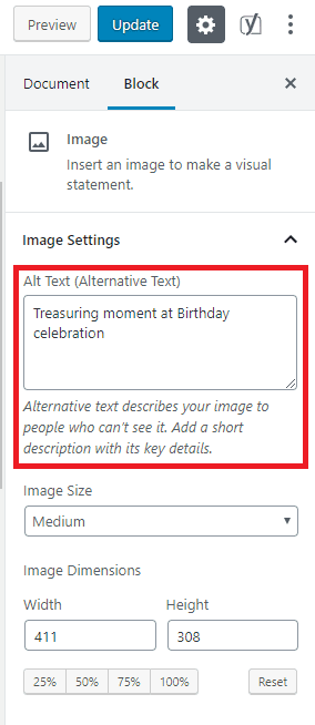 Alt Text is important because it informs search engines what the image is and assists any sight-impaired Internet users who visit your website. Access the Alt Text box on the right sidebar. As an alternative, you can add Alt Text on the Image Details page. To access Image Details, click on your photo and click the Edit Pencil icon above the photo. Type your keyword or phrase into the Alternative Text box and Save.