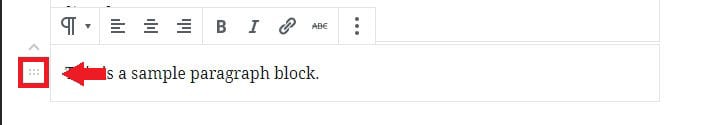 Move a block to a new position on your page by hovering your cursor over the block. Click and hold the 6 dots and drag the block to where you want it. As an alternative, use the Move Up and Move Down arrow to the left of the block. Click the Up or Down arrow to move the block.