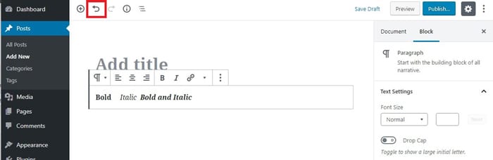 If you ever need to undo your changes, the undo button is the arrow next to the plus sign “+” icon in the upper left corner. If you make a mistake or change your mind about your text, click the undo arrow icon to undo what’s been done.